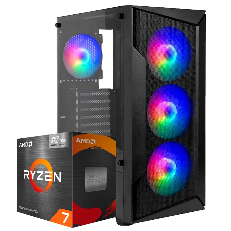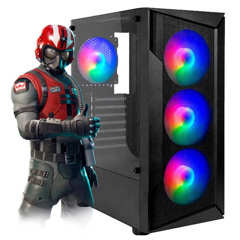 Una máquina imponente desde el primer vistazo. Esta PC Gamer destaca por su gabinete de diseño agresivo y moderno, con acabados negros mate y detalles en RGB personalizable que iluminan el interior con estilo. Las líneas anguladas del chasis y el panel lateral transparente permiten ver los componentes internos, ofreciendo un efecto visual impactante ideal para setups gamer. El teclado y mouse (opcionales) complementan la estética con retroiluminación en colores vibrantes, creando un entorno envolvente para largas sesiones de juego. El sistema de ventilación se integra con elegancia en la estructura, manteniendo el flujo de aire sin comprometer la estética.