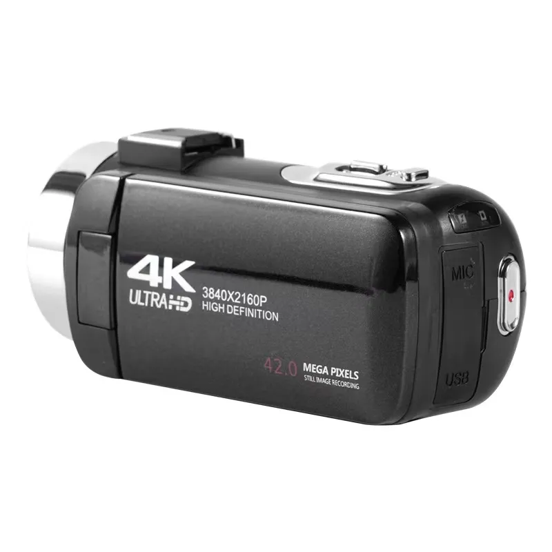La cámara RENVMEXY 901A-4K presenta un diseño compacto con un acabado completamente en negro mate, que refuerza su apariencia profesional y moderna. Su cuerpo cilíndrico y ergonómico está optimizado para ser fácil de sostener, lo que la convierte en una opción ideal para grabaciones móviles o vlogging, En el frontal, el gran lente sobresale ligeramente, rodeado por un aro metálico que aporta un detalle sofisticado y técnico. Justo detrás, se encuentra una pantalla articulada de 3 pulgadas, delgada y bien integrada al cuerpo, pensada para facilitar la visualización en distintas posiciones