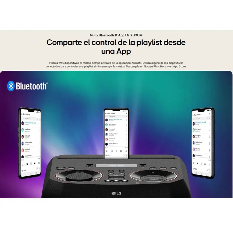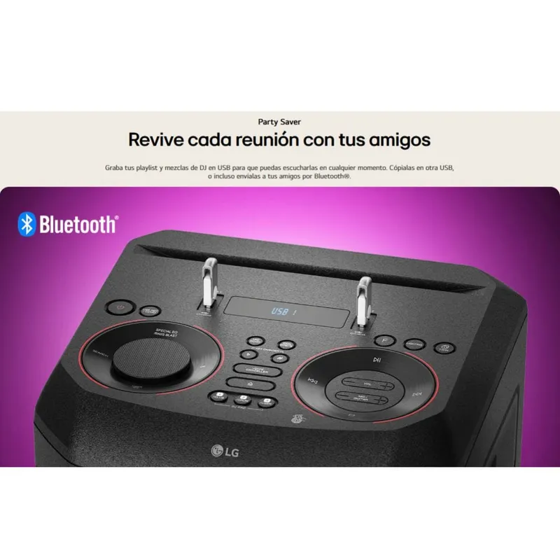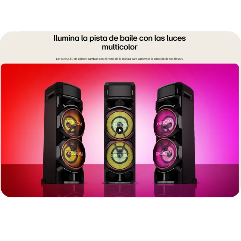 El LG XBOOM RNC9 impone presencia con un diseño audaz, robusto y lleno de energía visual. Su estructura vertical está diseñada para destacar en cualquier ambiente, combinando acabados en negro mate con detalles brillantes que realzan su estética moderna. Las rejillas frontales protegen los potentes parlantes internos y están acompañadas por anillos LED multicolor que se iluminan al ritmo de la música, creando un verdadero espectáculo visual.