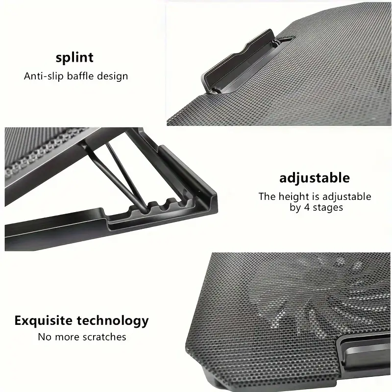 Este soporte de refrigeración destaca por su diseño robusto y futurista, pensado para ofrecer funcionalidad sin perder estilo. Su estructura metálica perforada permite una óptima ventilación, mientras que su acabado en negro mate le da una apariencia elegante y resistente.