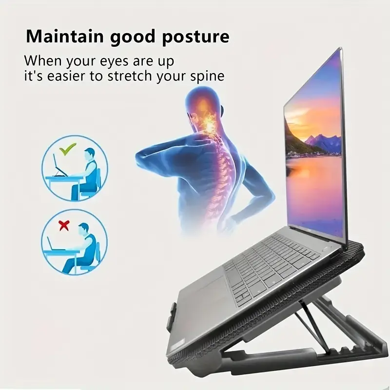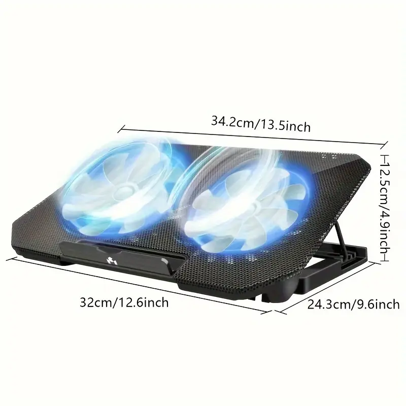 Incorpora luces LED (generalmente en tonos azules o rojos) que se encienden con los ventiladores, añadiendo un toque gamer y tecnológico al ambiente. Su forma ergonómica y ajustable permite inclinar la laptop en diferentes ángulos, aportando comodidad visual y una postura más natural al escribir. En conjunto, es un accesorio moderno que complementa cualquier espacio de trabajo o setup.
