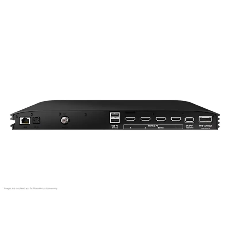 Incorpora una base central minimalista de acabado metálico oscuro que aporta estabilidad sin distraer la atención de la pantalla. Además, gracias a la caja externa One Connect, todas las conexiones se agrupan en un solo cable que se conecta al televisor, manteniendo la parte trasera limpia y libre de cables enredados