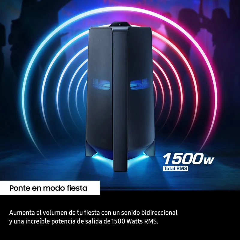 La Samsung MX-T70 impresiona desde el primer vistazo con un diseño robusto, elegante y moderno. Su estructura en forma de torre triangular le da una apariencia sólida y vanguardista, ideal para destacar en reuniones, fiestas o espacios amplios. El acabado en negro mate con detalles brillantes le otorga un estilo sofisticado y profesional.