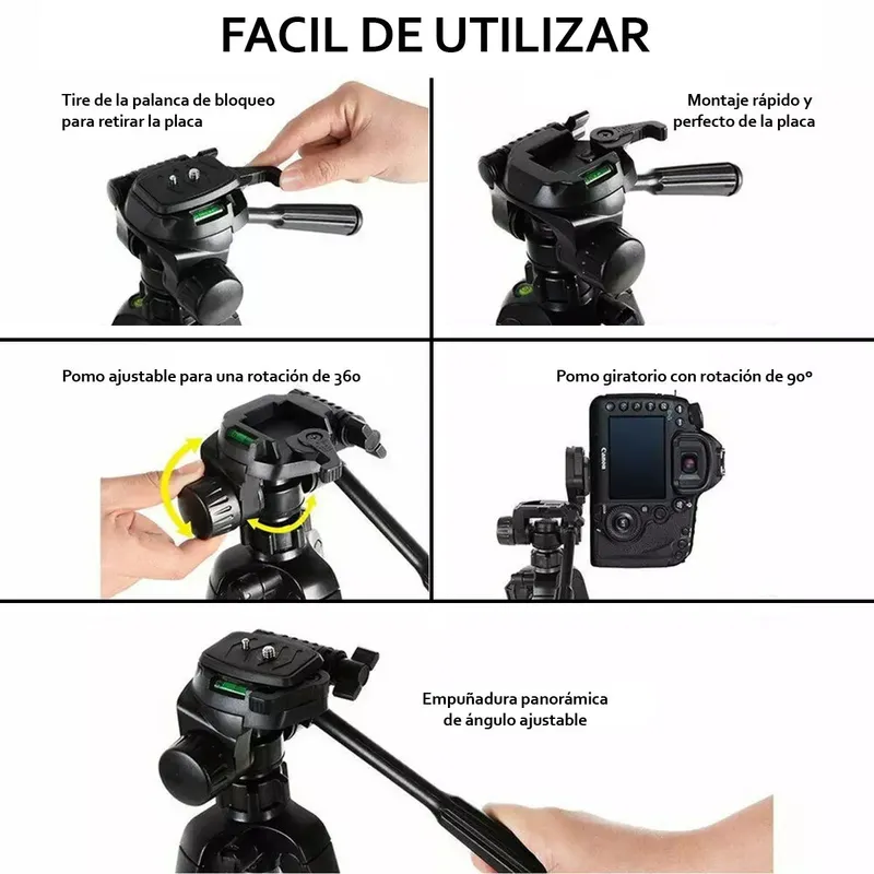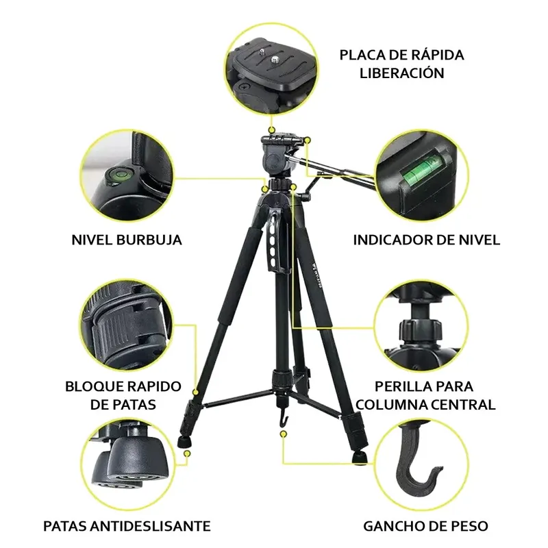 El Weifeng WT-3560 presenta una estética sobria y funcional, con patas de aluminio negro mate que proyectan un estilo profesional y compacto El acabado incluye elementos en plástico resistente, reforzando su imagen duradera y portátil Su cabezal de 3 vías permite movimientos de 360° horizontales y 90° verticales, con manija ergonómica que facilita el ajuste visual mientras mantiene una línea técnica limpia Cuenta además con nivel de burbuja integrado, lo que aporta funcionalidad y orden estético